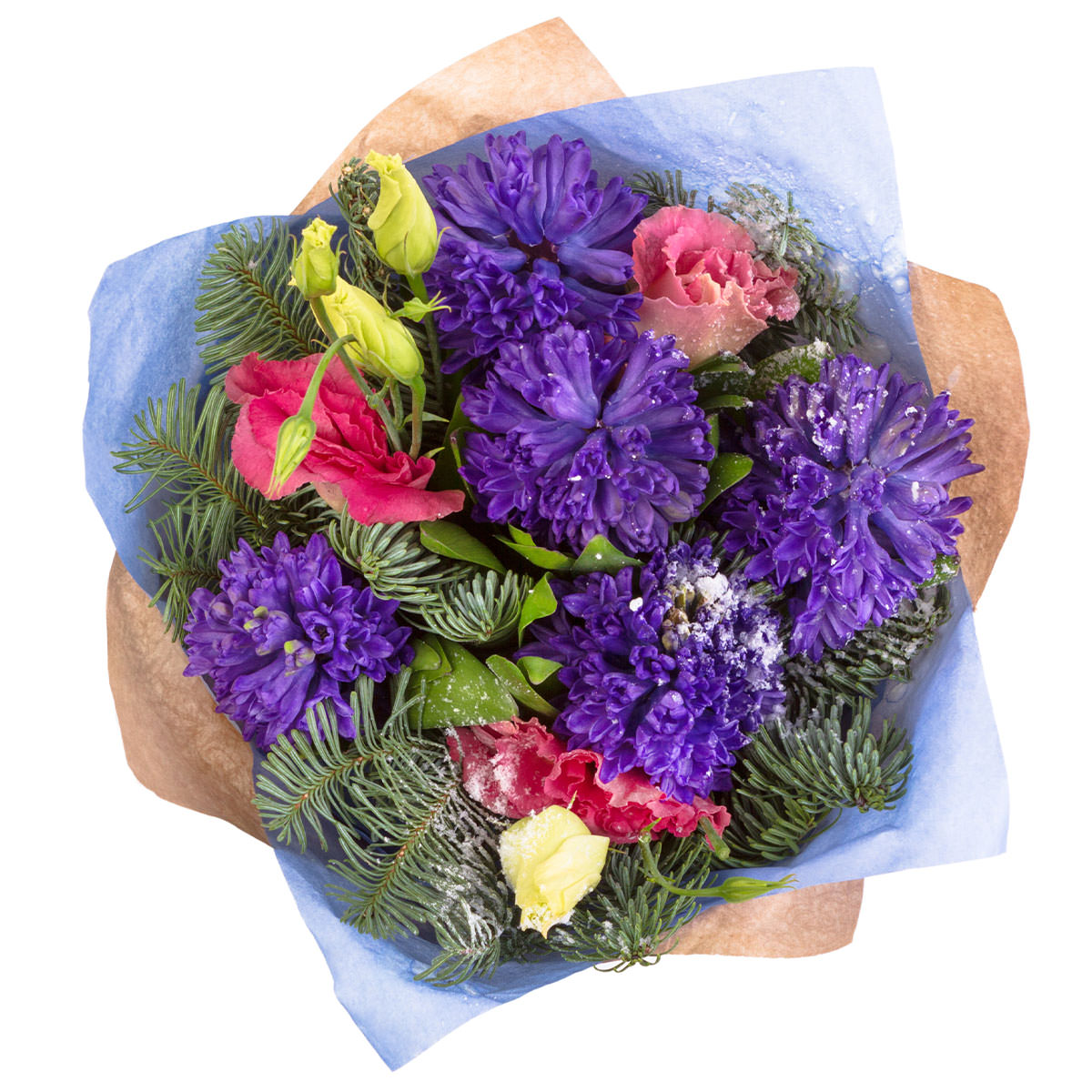 Гиацинт фиолетовый, эутома белая и розовая, пихта. Упаковка (лента, пленка, крафт, сетка, пленка матовая)