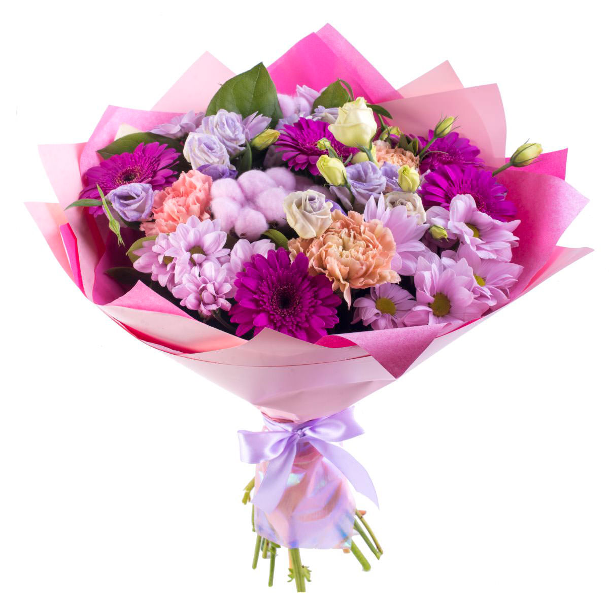 Хризантема кустовая светло-сиреневая, гербера сиреневая, эустома светло-фиолетовая, гвоздика розовая, хлопок. Упаковка (лента, пленка, крафт, сетка, пленка матовая)