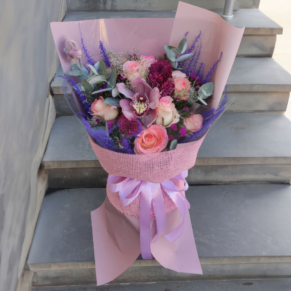 Орхидея розовая, роза одноголовая розовая, георгина мини бордовая, вероника, эвкалипт. Упаковка (лента, пленка, крафт, сетка, пленка матовая)