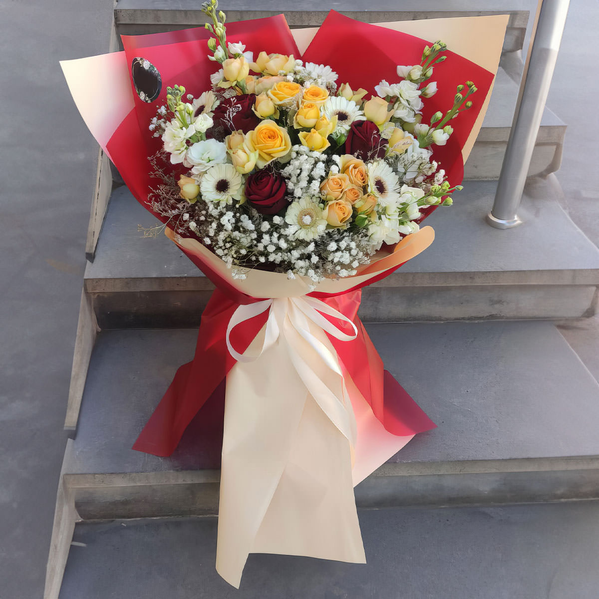 Роза одноголовая красная, роза кустовая желтая, маттиола белая, гербера мини белая, гипсофила, лимониум. Упаковка (лента, пленка, крафт, сетка, пленка матовая)