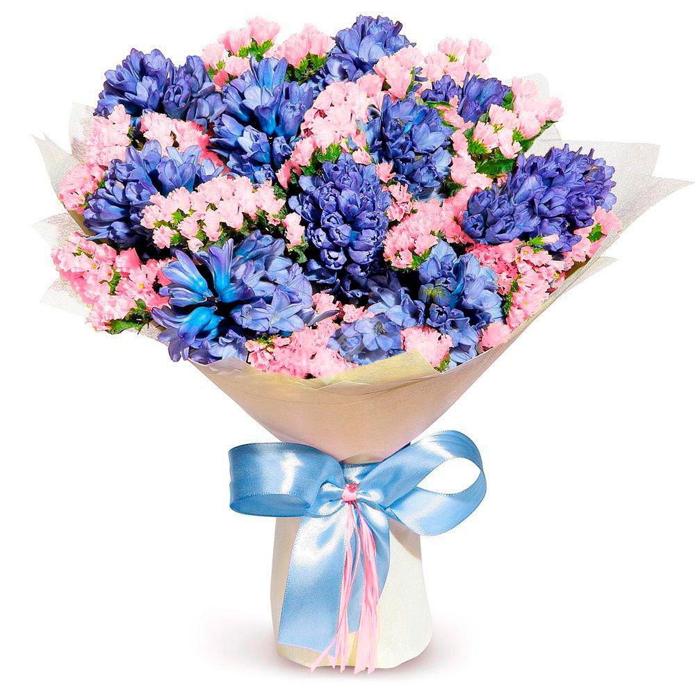 Гиацинт синий, статица розовая. Упаковка (лента, пленка, крафт, сетка, пленка матовая)