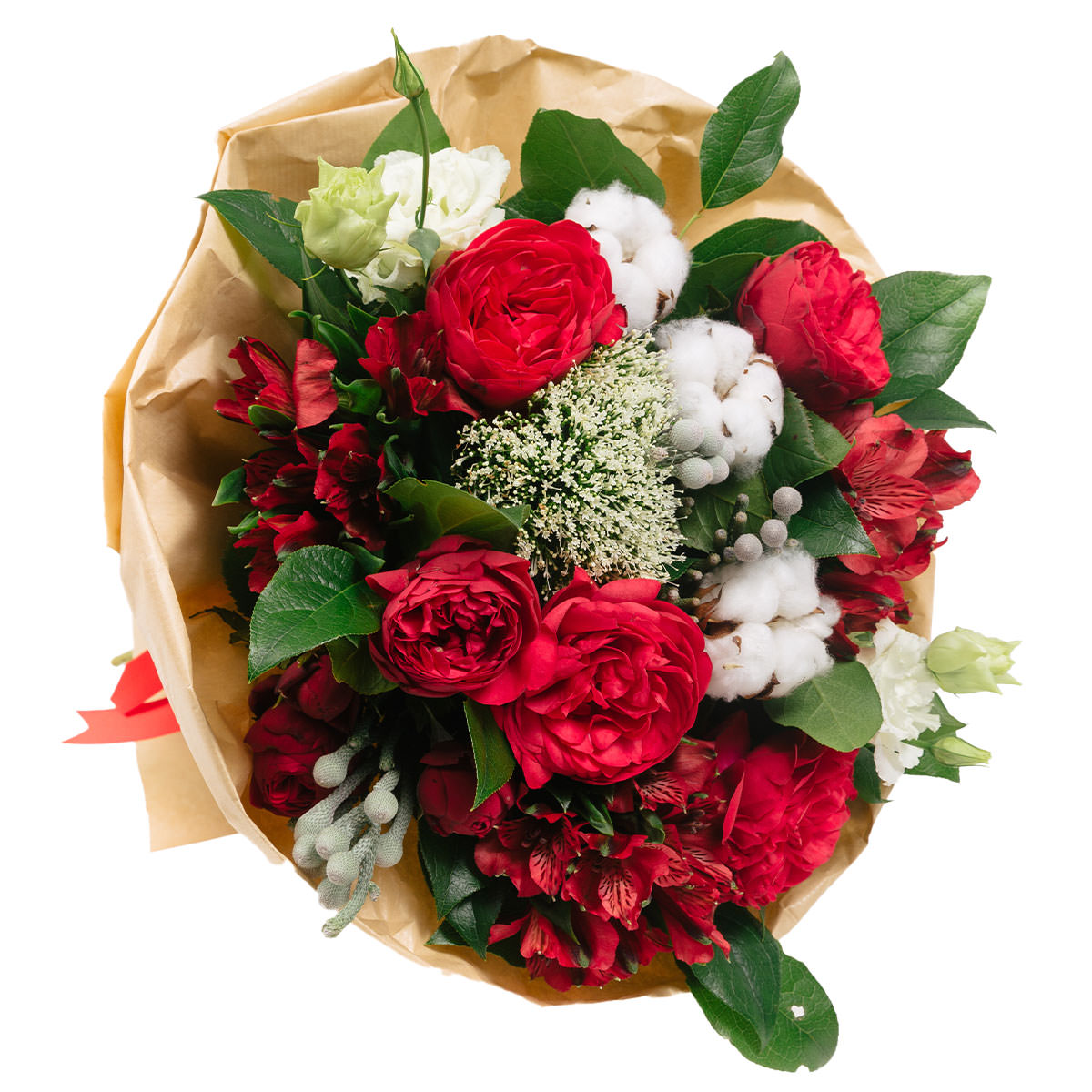 Роза одноголовая пионовидная красная, альстромерия красная, эустома белая, бруния, хлопок. Упаковка (лента, пленка, крафт, сетка, пленка матовая)
