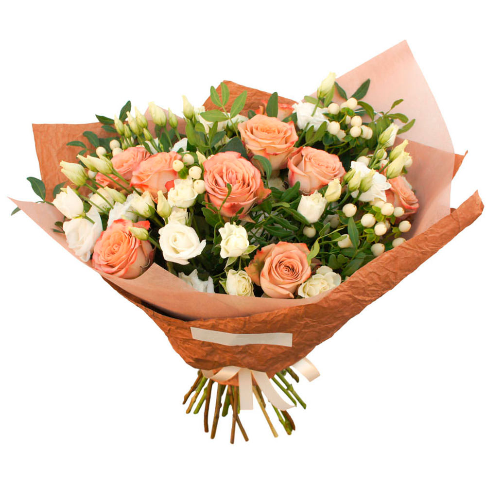 Роза одноголовая пыльно-розовая, эустома белая, гиперикум, фисташка. Упаковка (лента, пленка, крафт, сетка, пленка матовая)