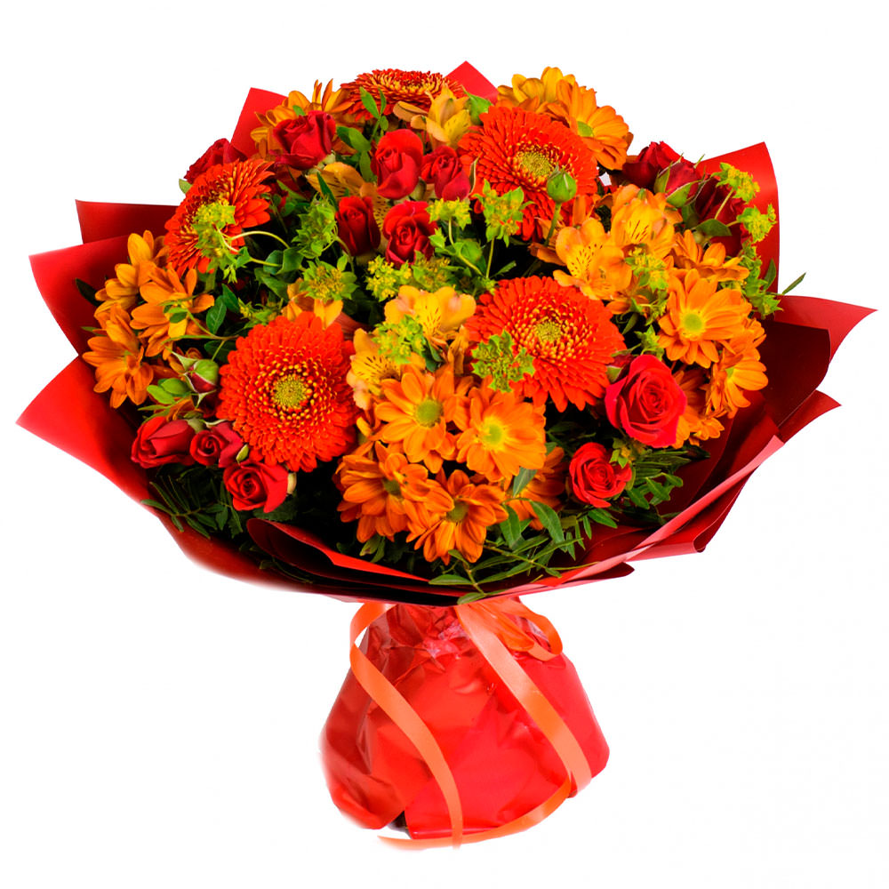 Гербера оранжевая, кустовая роза красная, хризантема оранжевая, альстромерия оранжевая, фисташка. Упаковка (лента, пленка, крафт, сетка, пленка матовая)
