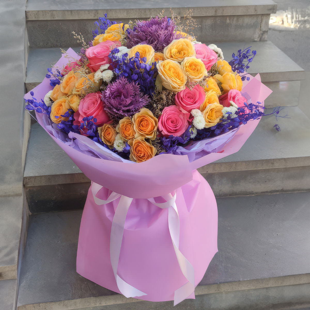 Роза одноголовая розовая, роза кустовая желтая, брассика сиреневая, хризантемы мини белые, лунария синяя. Упаковка (лента, пленка, крафт, сетка, пленка матовая)