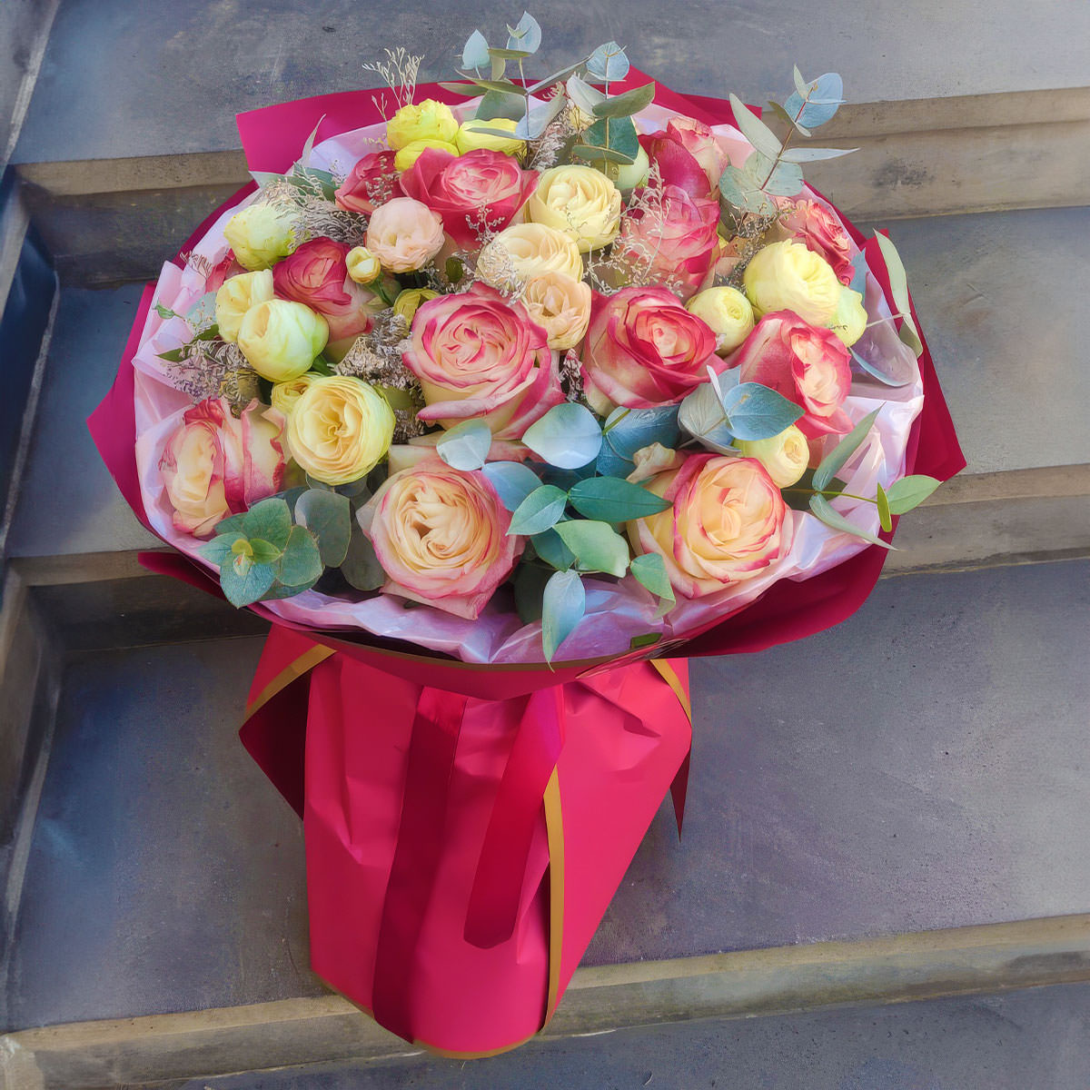 | Состав | Кустовые розы, Пионовидные розы, Розы, Эвкалипт |