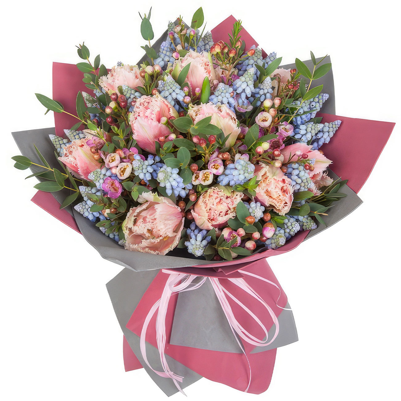 Ваксфлауэр, тюльпан, гиацинт, зелень. Упаковка (лента, пленка, крафт, сетка, пленка матовая)