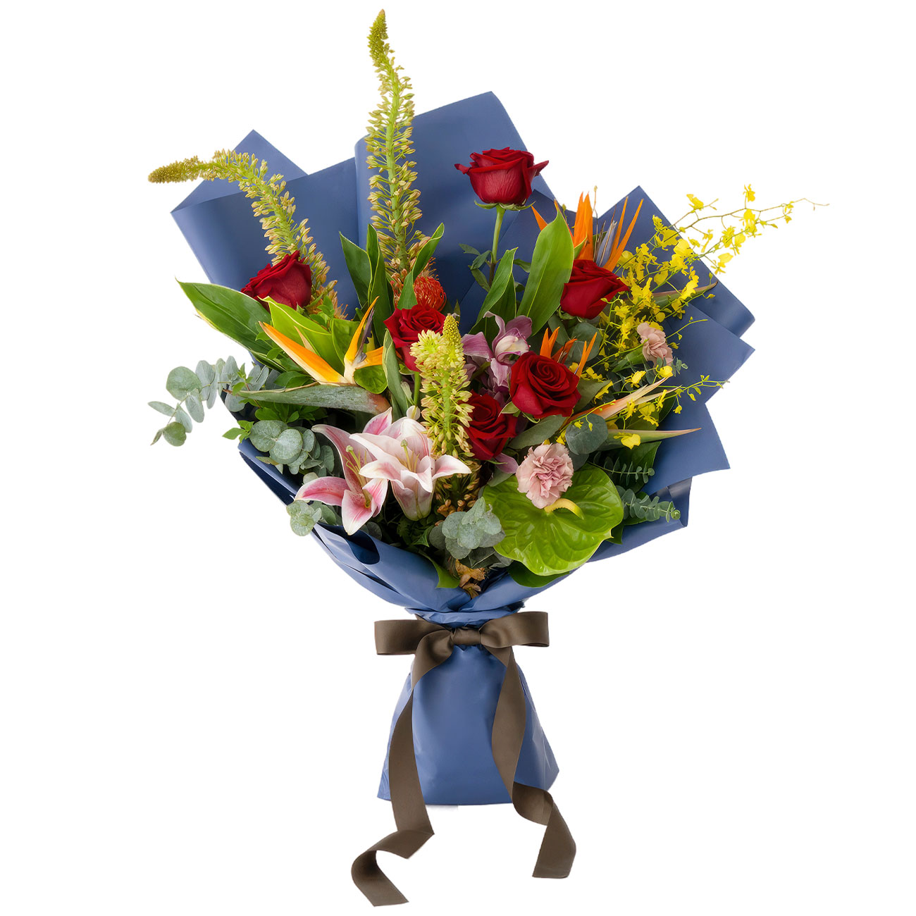 | Состав | Гвоздики, Кустовые розы, Орхидеи, Розы, Эвкалипт |