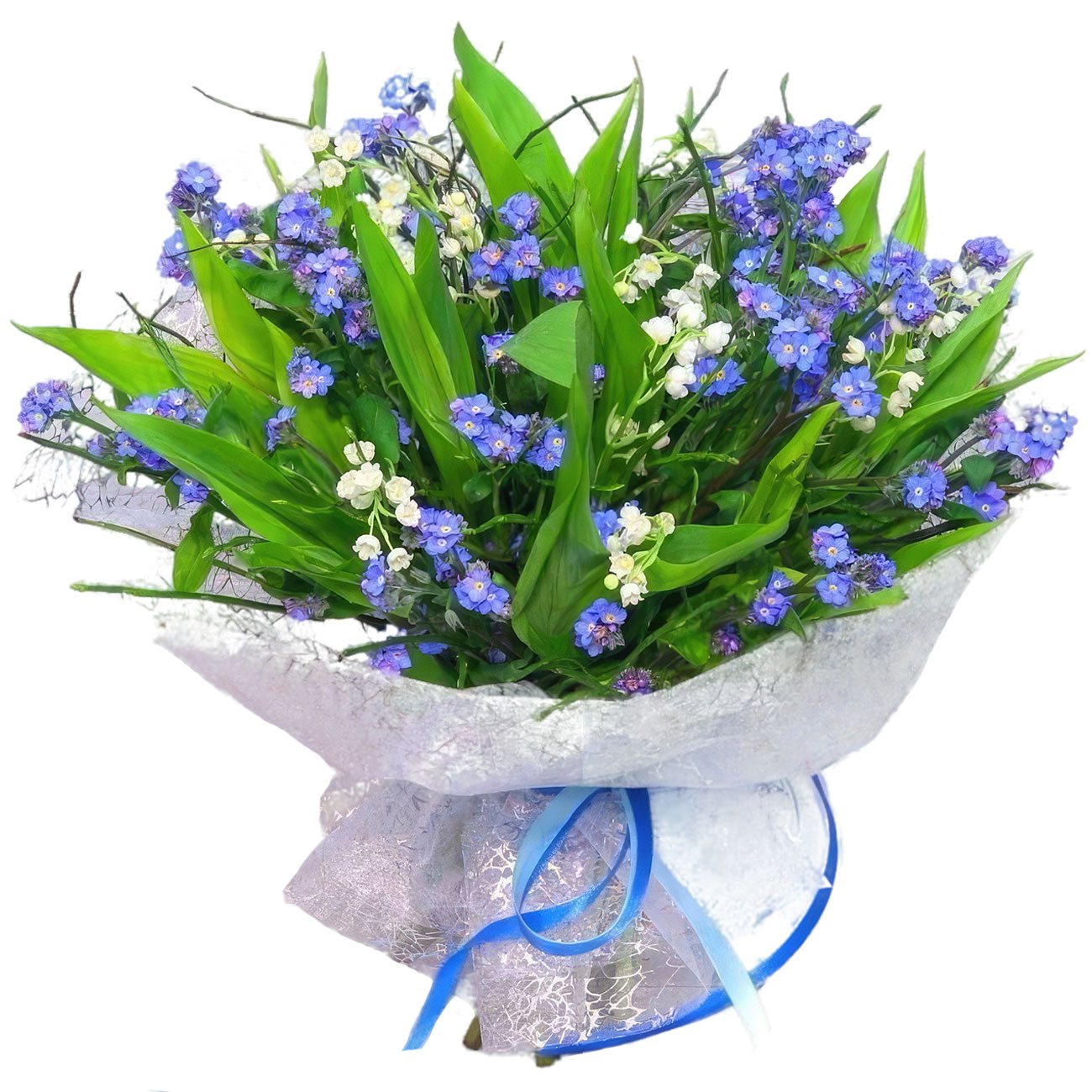 Незабудка, ландыш, зелень. Упаковка (лента, пленка, крафт, сетка, пленка матовая)